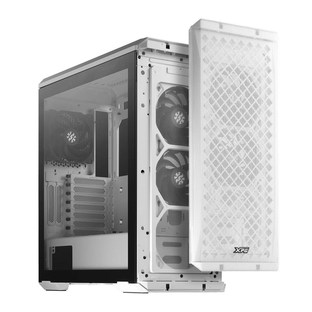xpg defender admite e-atx de tamaño completo con diseño de panel frontal mesh. disponible en colores blanco y negro con 3 ventiladores xpg vento 120 incluidos.